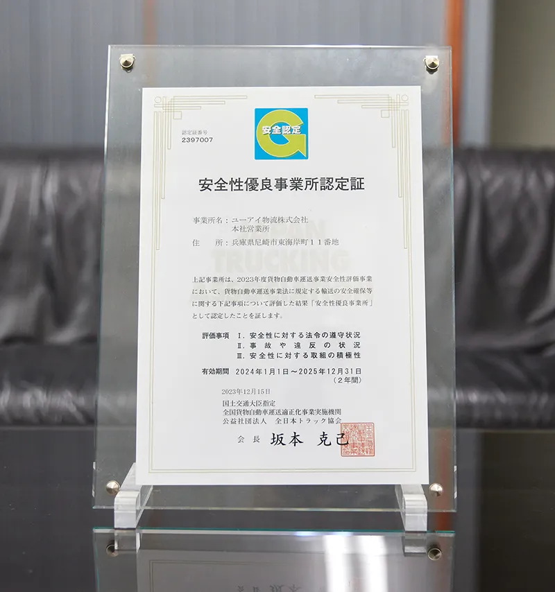 月全日本トラック協会が認定する「安全性優良事業所(Gマーク)」を取得。安全を最優先に考え、社員が安心して働ける環境づくりを推進しています。